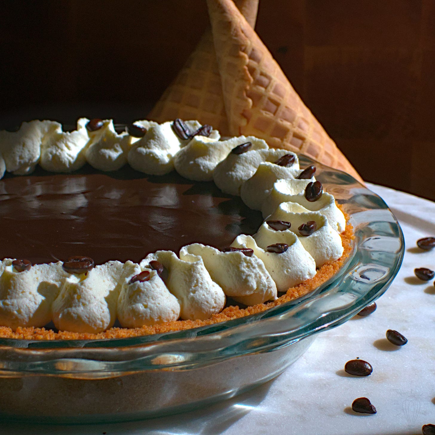 We’re continuing our ice cream theme this week with a pie inspired by one of my favorite ice cream dishes: the affogato! A pretty simple dessert, the affogato is a scoop of vanilla ice cream topped with a shot of espresso. The espresso freezes and blends with the ice cream in a unique way, creating three distinct layers of flavor: the bitter espresso on top, the blended middle of coffee and vanilla flavors, and the sweet vanilla ice cream on the bottom. I did my best to replicate that experience with this recipe. And what better crust for an ice cream-inspired pie than one made of waffle cones?