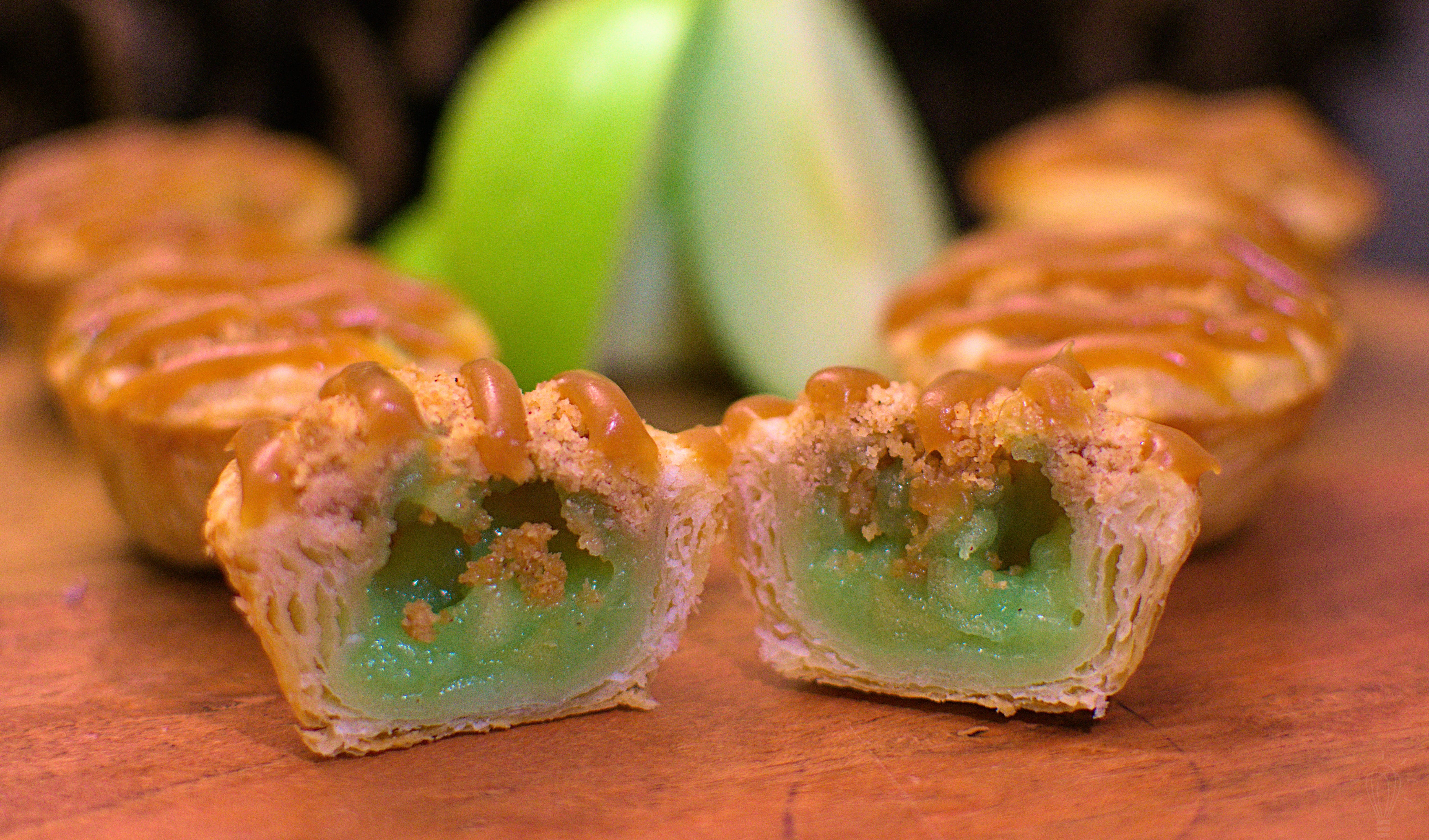 Remove the chilled pie crusts from the fridge and fill each crust with 1 teaspoon of sour apple filling.