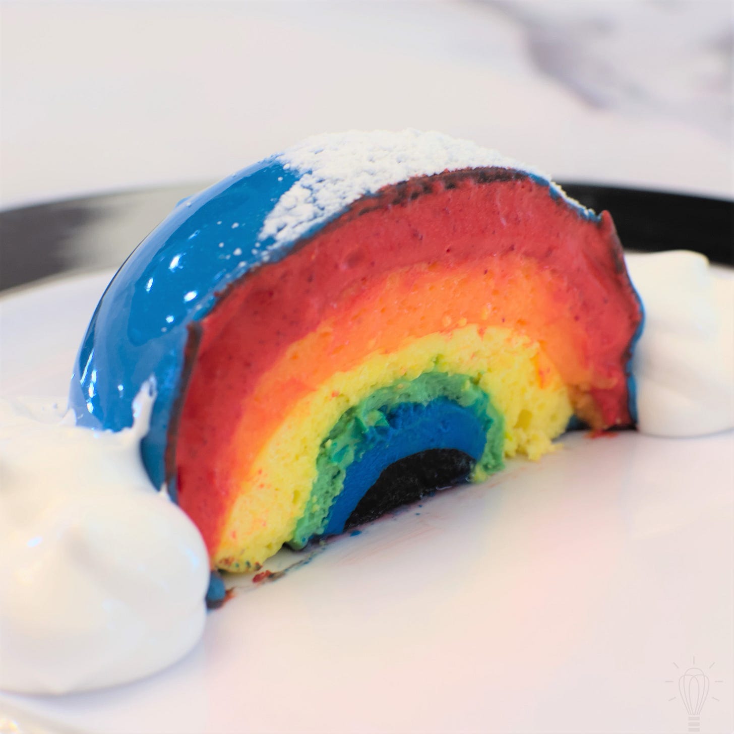 Sitting on a bed of fluffy meringue clouds, this vibrantly colorful cake boasts six unique types of dessert, bursting with raspberry, lemon, and blueberry flavor.