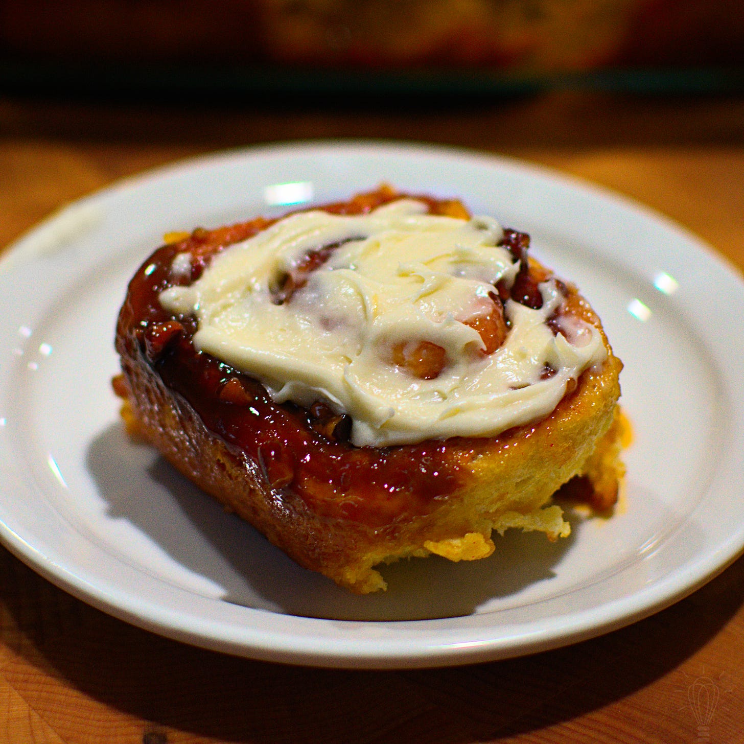 There is nothing better on a cold day than a sticky bun that warms you from the inside, full of peaches and bourbon, toasted pecans, spicy gochujang caramel, and mascarpone frosting.